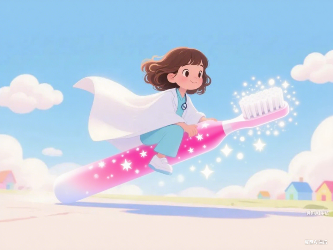 牙医小姐姐点点头,温柔地说:“别着急,我这就出发。”她穿上白色的斗篷,骑上闪闪发光的电动牙刷,嗖的一下飞进了小熊的嘴巴世界!一进去,她就拿出神奇的镜子,轻轻照向一颗已经被蛀坏的小牙。“原来是因为不刷牙惹的祸啊。”她叹了口气,“每天早晚都要刷牙,这样才能赶走细菌哦。”